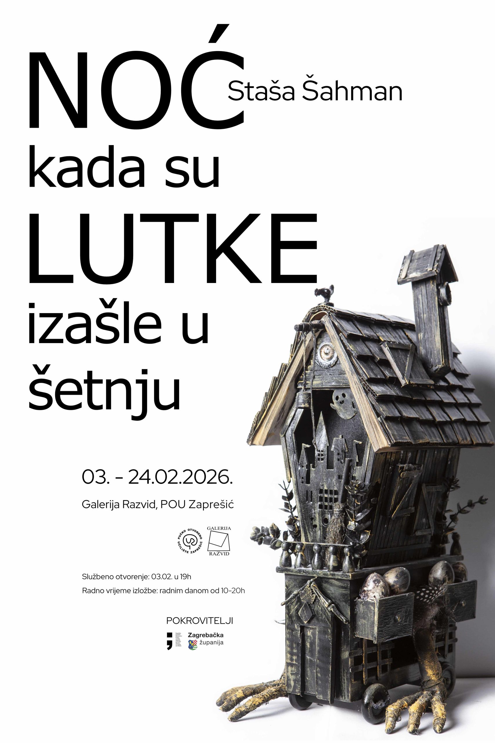 Izložba „Noć kada su lutke izašle u šetnju“ autorice Staše Šahman predstavlja niz lutaka-likova koji egzistiraju na granici bajke, groteske i kazališne scene. Svaka lutka oblikovana je kao samostalan karakter s vlastitom osobnošću, prošlošću i unutarnjom logikom, a njihove priče utkane su u same materijale, geste i kostime.