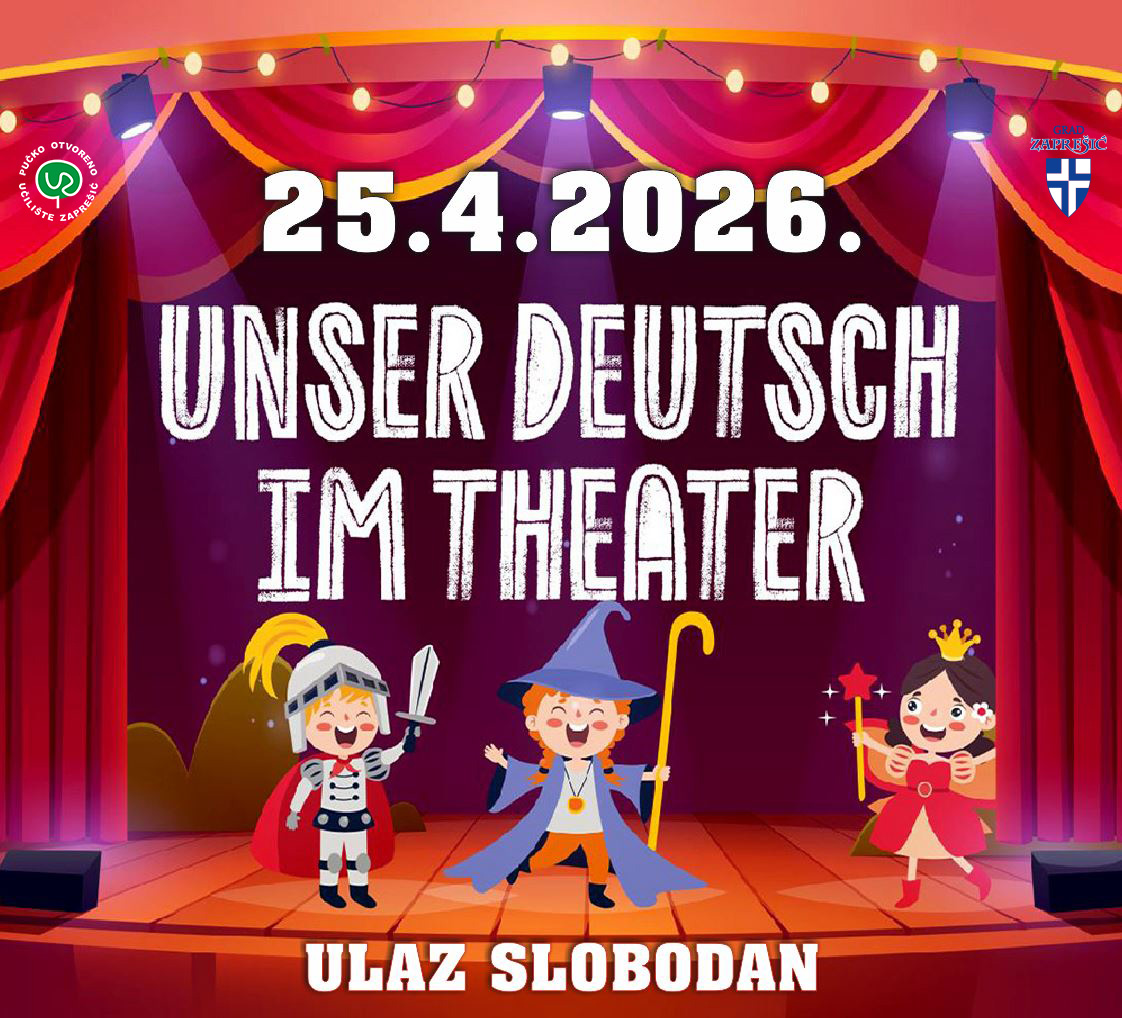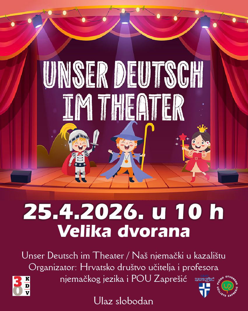 Pozivamo vas da nam se pridružite 25. travnja 2026. godine u Pučkom otvorenom učilištu Zaprešić i zajedno s nama doživite ovu posebnu kazališnu priču. Očekuju vas vedre, šarene i razigrane predstave, puno osmijeha i trenutaka koji podsjećaju koliko učenje može biti zabavno, živo i ispunjeno radošću. Dođite, podržite male izvođače i uživajte u kazalištu koje govori – smijehom, igrom i njemačkim jezikom.